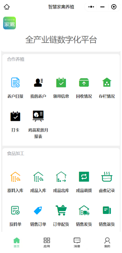 惠顺家禽全新版本,本应用集成了种禽孵化、蛋禽养殖、公司加农户、肉禽自养、屠宰加工、食品加工等全产业链数字化管理平台。
